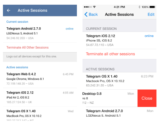 今天的Telegram更新除了提供丰富的链接摘要外,还在隐私和安全设置中新增了“活动会话”功能。此屏幕会显示所有已登录设备的IP信息。您还可以关闭任何过期或(但愿不会!)可疑的会话。